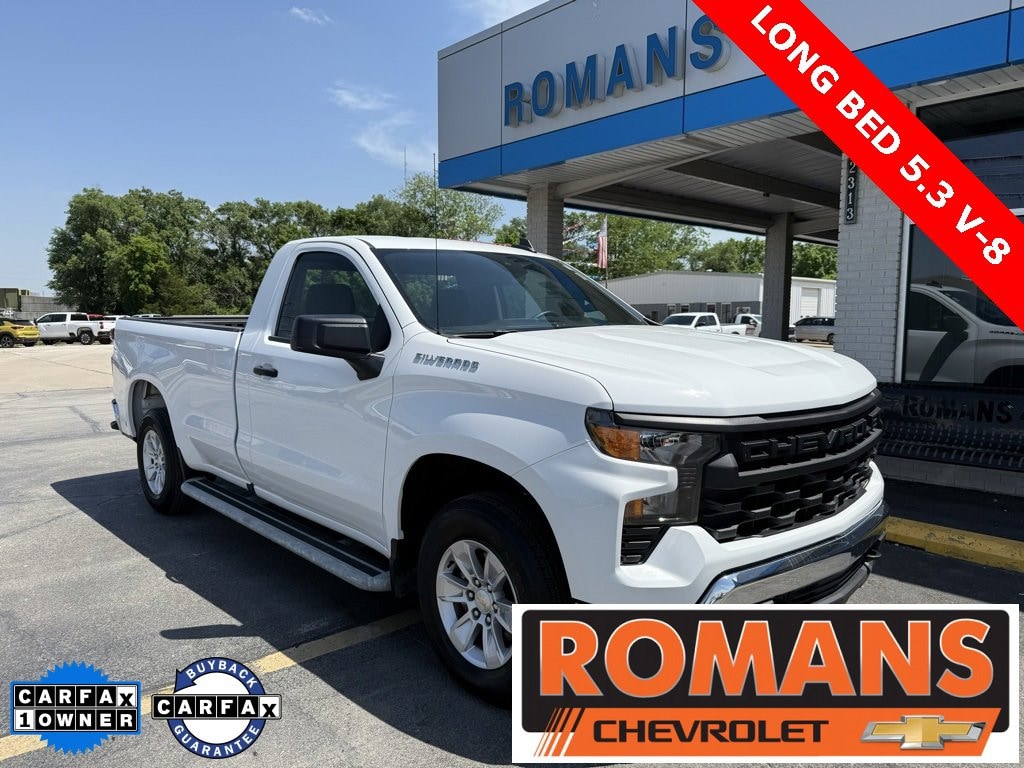 *Family owned since 1967* CARFAX One-Owner. 2024 Chevrolet Silverado 1500 WT Summit White WT 2D Standard Cab RWD 10-Speed Automatic EcoTec3 5.3L V8 10-Speed Automatic, Black Cloth, 3.5 Monochromatic Display Driver Info Center, Air Conditioning, Black (Semi-Gloss) Front Bumper, Black (Semi-Gloss) Rear Bumper, Bluetooth® For Phone, Chevrolet Connected Access Capable, Deep-Tinted Glass, Electric Rear-Window Defogger, Electrical Steering Column Lock, Electronic Cruise Control, Front Chrome Bumper, Front Frame-Mounted Black Recovery Hooks, HD Rear Vision Camera, Heated Power-Adjustable Outside Mirrors, Heavy-Duty Air Filter, High Gloss Black Mirror Caps, Hitch Guidance, Inside Rear-View Mirror w/Tilt, Lane Change Alert w/Side Blind Zone Alert, Locking Tailgate, Manual Tailgate Function w/No EZ Lift, Manual Tilt Wheel Steering Column, OnStar & Chevrolet Connected Services Capable, Perimeter Lighting, Power Front Windows w/Driver Express Up/Down, Power Front Windows w/Passenger Express Down, Preferred Equipment Group 1WT, Premium audio system: Chevrolet Infotainment 3, Rear Chrome Bumper, Rear Cross Traffic Braking, Rear Pedestrian Alert, Remote Keyless Entry, Rubberized-Vinyl Floor Covering, SiriusXM Delete, Solar Absorbing Tinted Glass, Standard Suspension Package, Standard Tailgate, Trailering Package, Ultrasonic Front & Rear Park Assist, Wi-Fi Hot Spot Capable, Work Truck Package, WT Convenience Package, WT Safety Package, WT Value Package, 170 Amp Alternator, 2 Speakers, 2-Speaker Audio System, 220 Amp Alternator, 3.23 Rear Axle Ratio, 3.42 Rear Axle Ratio, 4-Wheel Disc Brakes, 40/20/40 Front Split Bench Seat, ABS brakes, Auto High-beam Headlights, Automatic Emergency Braking, Auxiliary External Transmission Oil Cooler, Brake assist, Compass, Delay-off headlights, Driver door bin, Dual front impact airbags, Dual front side impact airbags, Electronic Stability Control, External Engine Oil Cooler, EZ Lift Power Lock & Release Tailgate, Following Distance Indicator, Forward Collision Alert, Front anti-roll bar, Front Center Armrest w/Storage, Front Pedestrian Braking, Front reading lights, Front wheel independent suspension, Fully automatic headlights, Heated door mirrors, Illuminated entry, IntelliBeam Automatic High Beam On/Off, Lane Keep Assist w/Lane Departure Warning, Low tire pressure warning, Occupant sensing airbag, Outside temperature display, Overhead airbag, Overhead console, Panic alarm, Passenger door bin, Passenger vanity mirror, Power door mirrors, Power steering, Power windows, Radio data system, Radio: Chevrolet Infotainment 3 System, Rear reading lights, Rear step bumper, Remote keyless entry, Speed-sensing steering, Tachometer, Tilt steering wheel, Traction control, Trip computer, Variably intermittent wipers, Vinyl Seat Trim, Voltmeter, Wheels: 17 x 8 Bright Silver Painted Aluminum, Wheels: 17 x 8 Ultra Silver Painted Steel, Recently Serviced., 10-Speed Automatic, Black Cloth, 3.5 Monochromatic Display Driver Info Center, Air Conditioning, Black (Semi-Gloss) Front Bumper, Black (Semi-Gloss) Rear Bumper, Bluetooth® For Phone, Chevrolet Connected Access Capable, Deep-Tinted Glass, Electric Rear-Window Defogger, Electrical Steering Column Lock, Electronic Cruise Control, Front Chrome Bumper, Front Frame-Mounted Black Recovery Hooks, HD Rear Vision Camera, Heated Power-Adjustable Outside Mirrors, Heavy-Duty Air Filter, High Gloss Black Mirror Caps, Hitch Guidance, Inside Rear-View Mirror w/Tilt, Lane Change Alert w/Side Blind Zone Alert, Locking Tailgate, Manual Tailgate Function w/No EZ Lift, Manual Tilt Wheel Steering Column, OnStar & Chevrolet Connected Services Capable, Perimeter Lighting, Power Front Windows w/Driver Express Up/Down, Power Front Windows w/Passenger Express Down, Preferred Equipment Group 1WT, Premium audio system: Chevrolet Infotainment 3, Rear Chrome Bumper, Rear Cross Traffic Braking, Rear Pedestrian Alert, Remote Keyless Entry, Rubberized-Vin